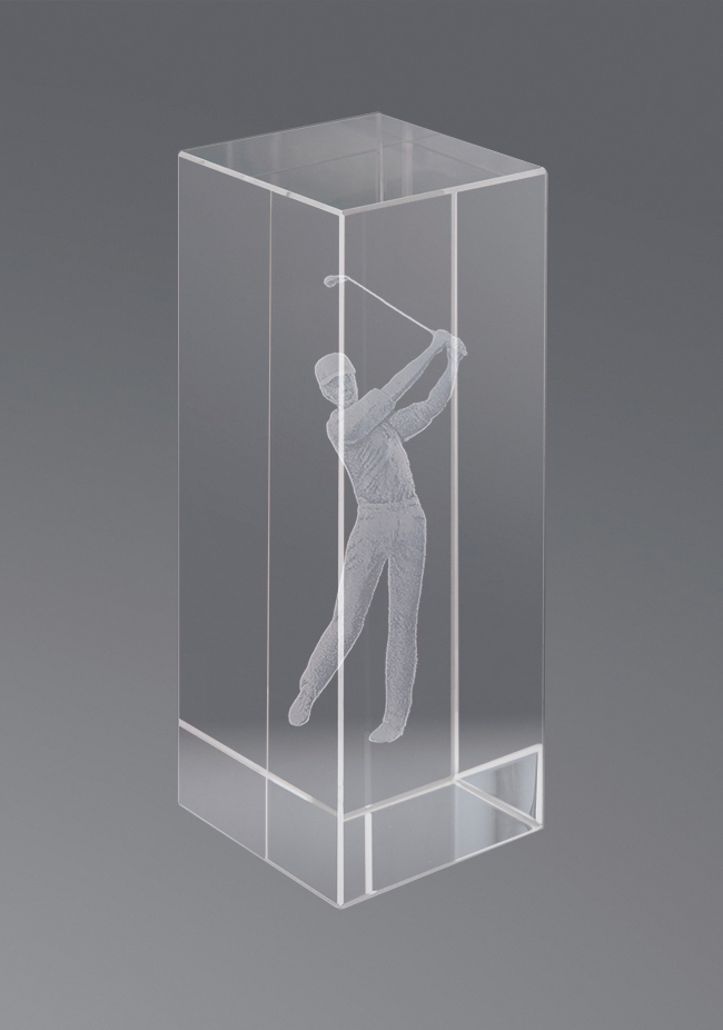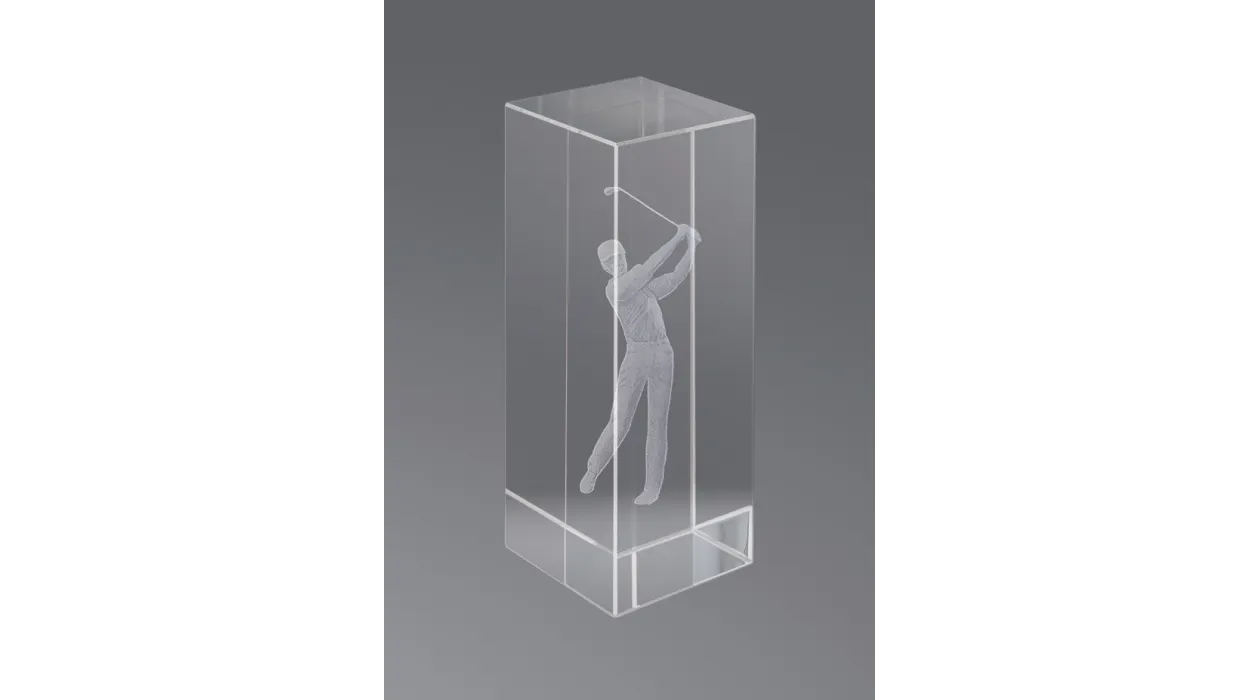 Kristall-Trophäe in 3D gemacht represantando einen männlichen Golfer. In verschiedenen Größen erhältlich.