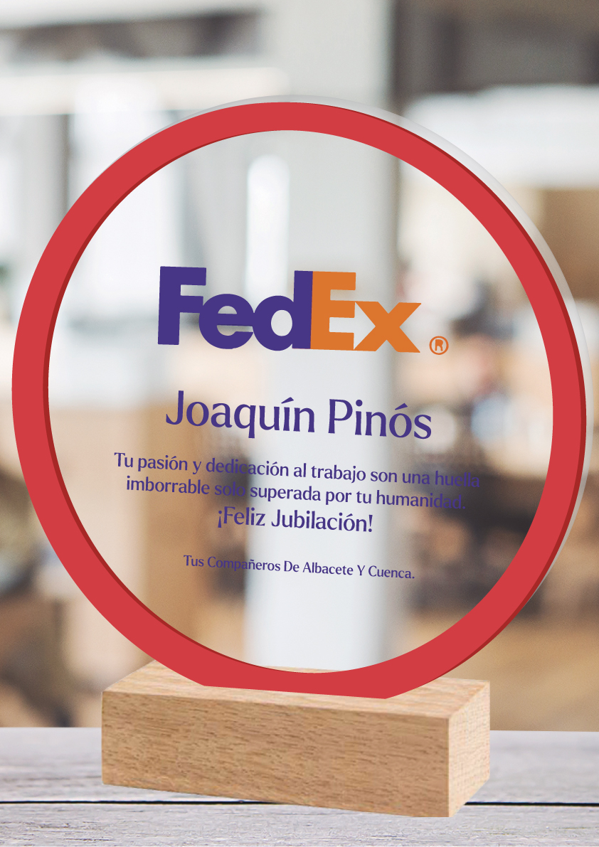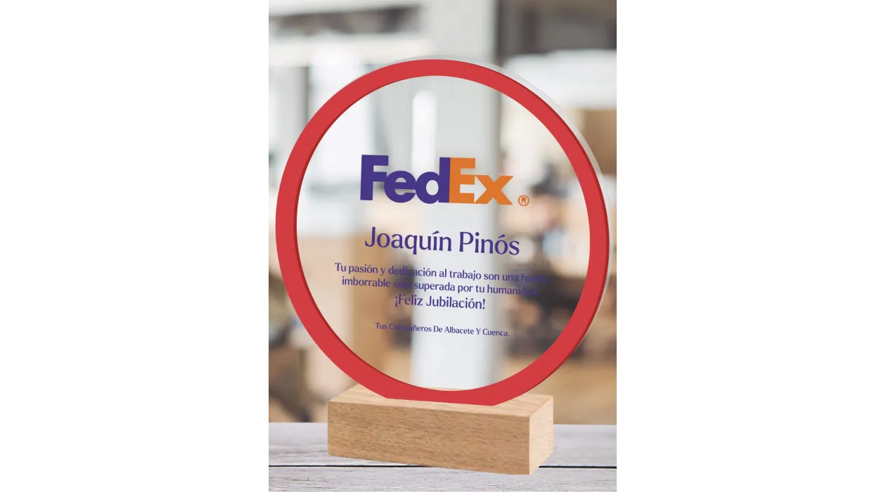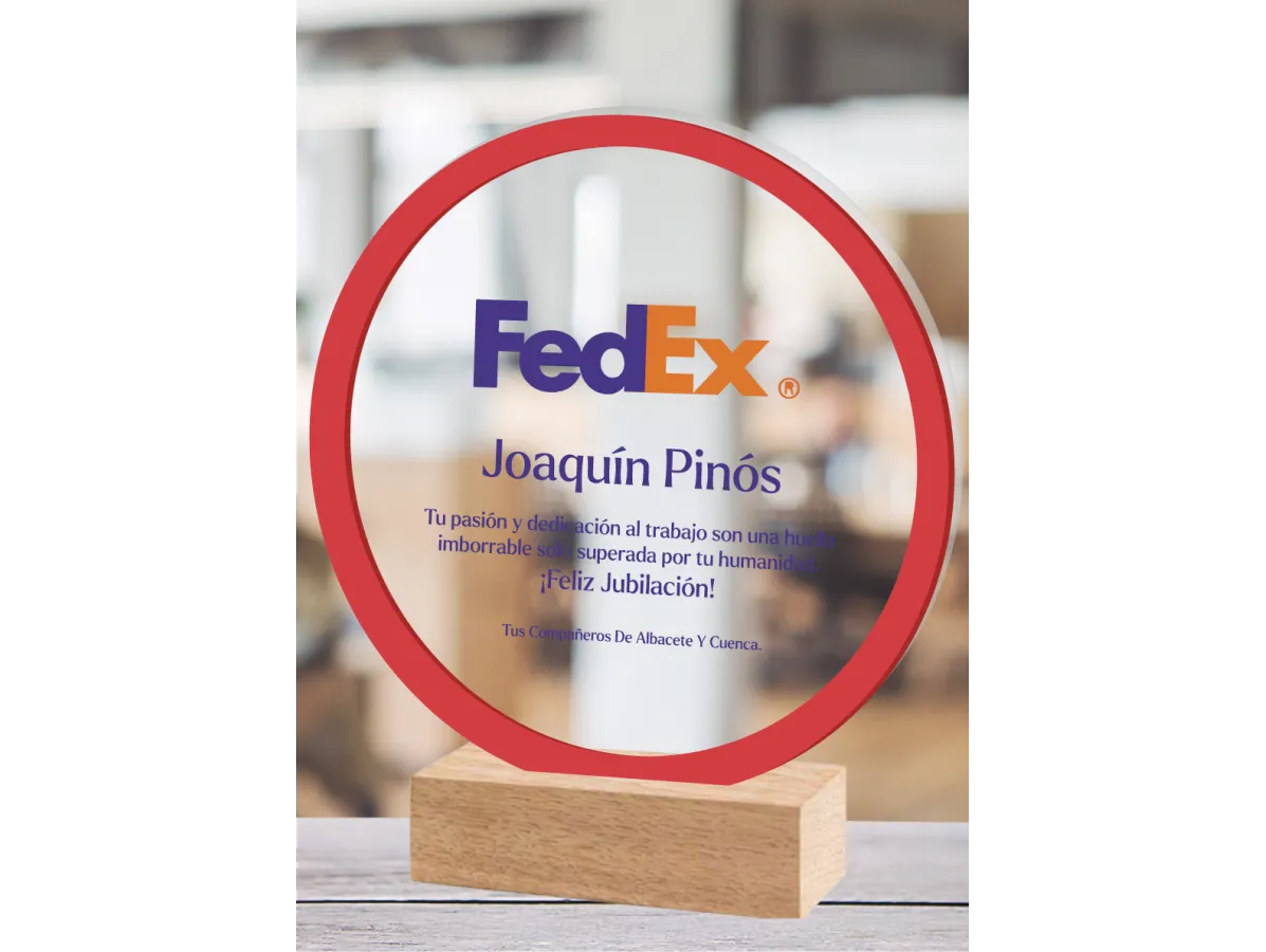 Die Trophäe aus Methacrylat ist im gesamten Kreisbereich farbig eingraviert, mit einer Methacrylatstärke von 8 mm in transparenter Farbe. Es umfasst einen Sockel aus natürlichem hellem Holz.