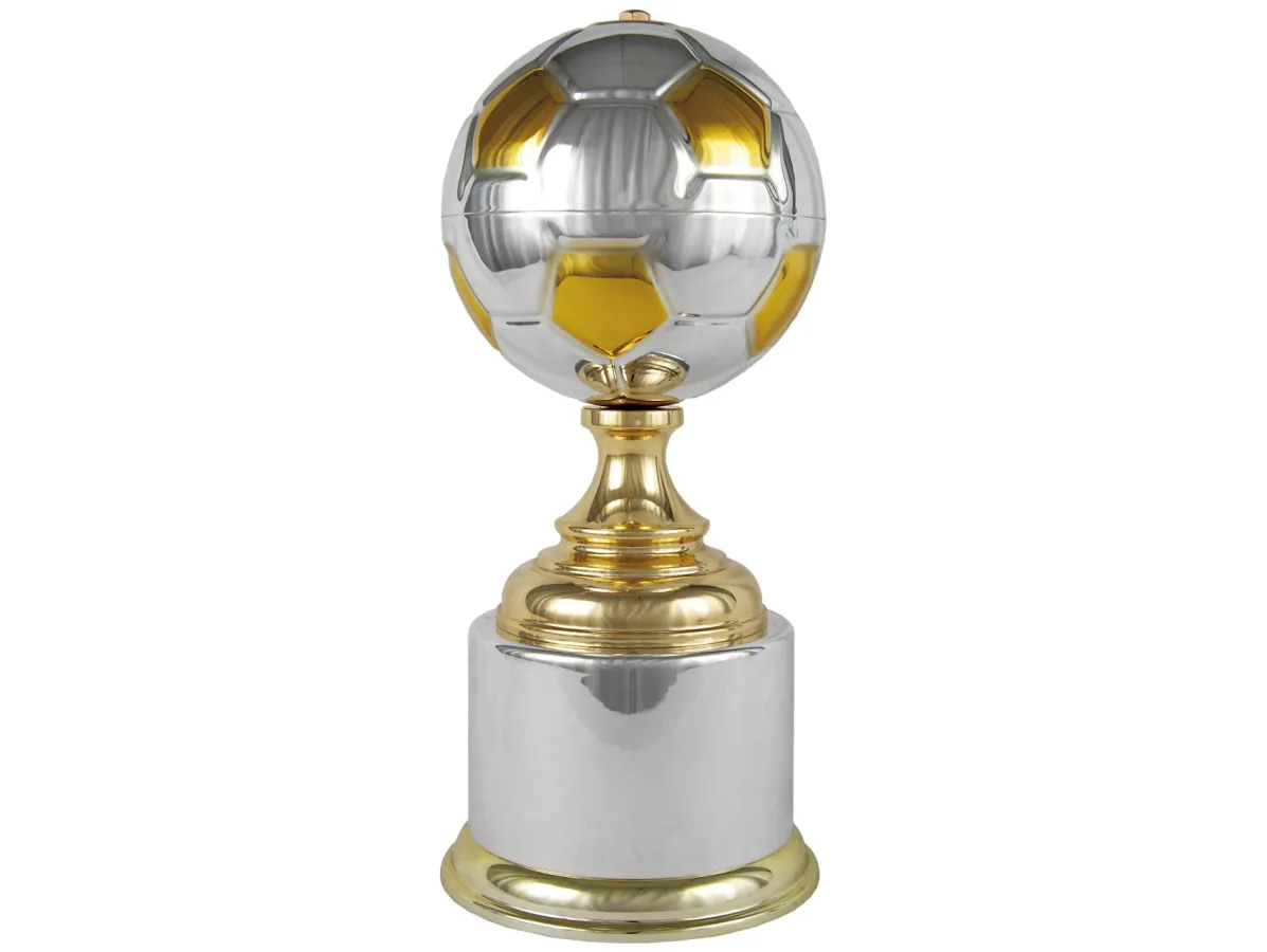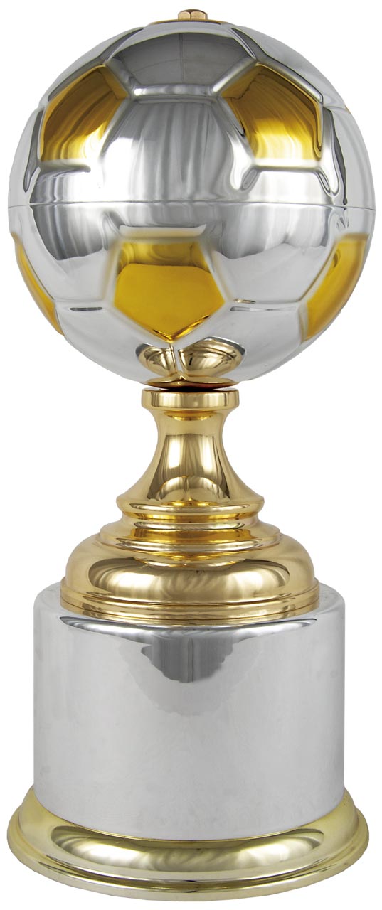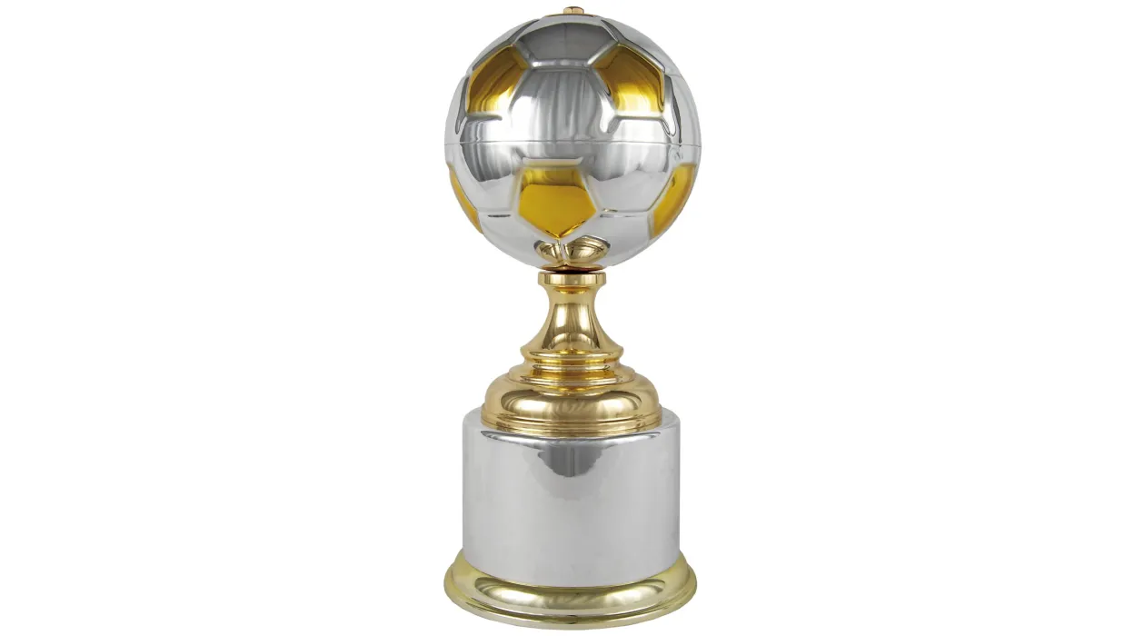 Trophäe in Form eines Pokals mit Fußball und runder Basis.