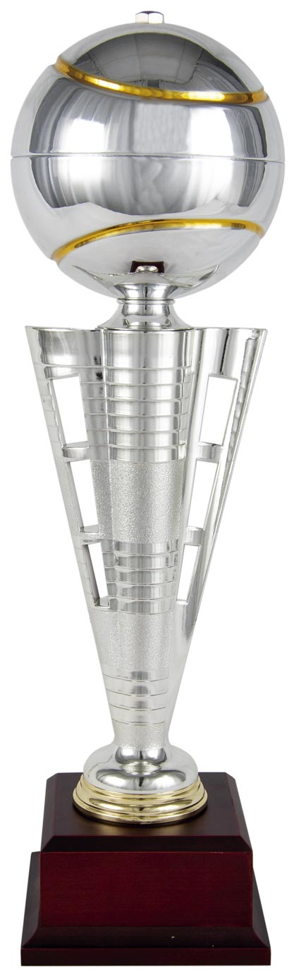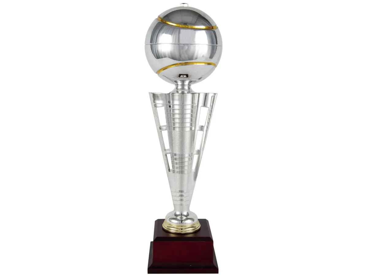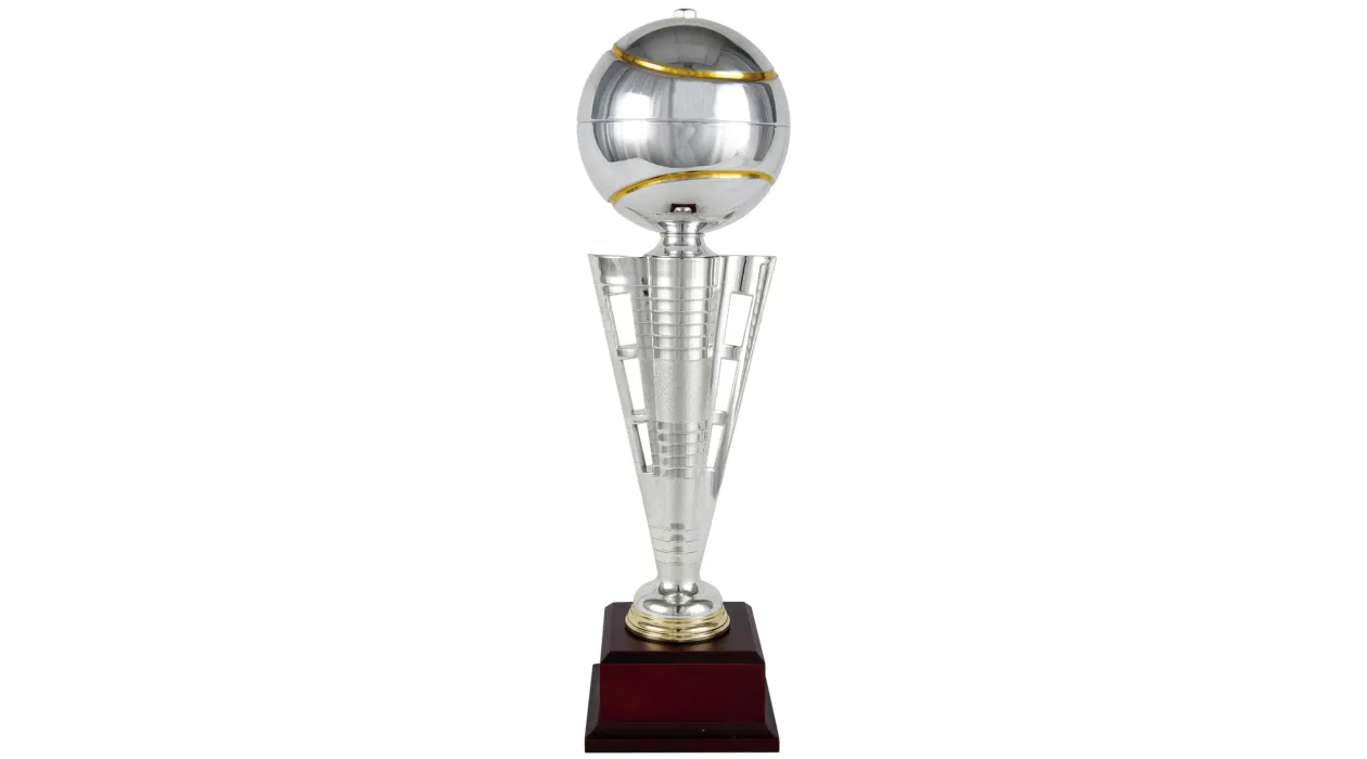 Kristall-Trophäe becherförmig. An seiner Spitze nimmt er einen Ball Paddel in Silber eingelegt. Und an der Unterseite trägt er eine Darstellung eines Schlägers und einer Kugel. Verschiedene Maßnahmen.