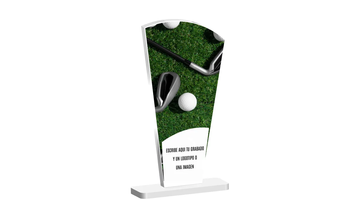 Golftrophäe aus weißem Methacrylat, um Ihr eigenes Bild auf der Rückseite hinzuzufügen. Das Methacrylat ist opak weiß und 5 mm dick. Die Basis besteht aus 6 mm dickem schneeweißem Methacrylat. Das Design beinhaltet das Golfbild, Sie fügen den Text im weißen Teil hinzu.