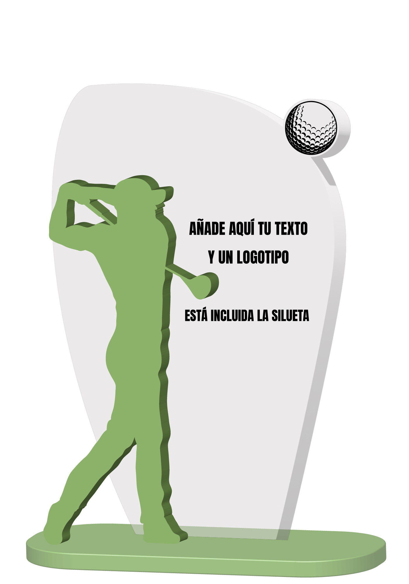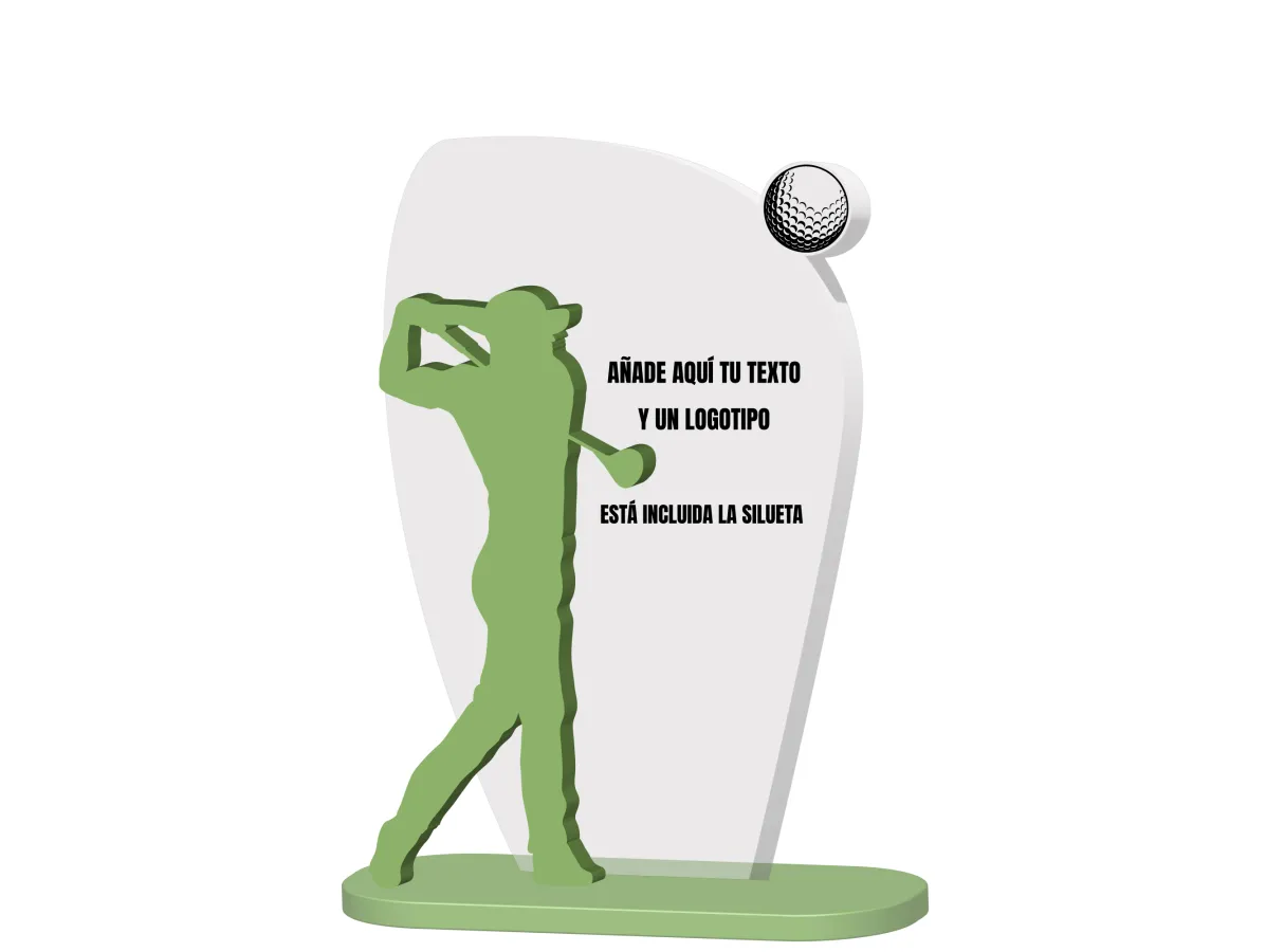 Trophäe aus Methacrylat in den Farben transparent und mattgrün. 8mm bzw. 6mm. Golf-Silhouette inklusive. Sie können die gewünschte Gravur mit einem Text und Logo oder einem Foto hinzufügen.