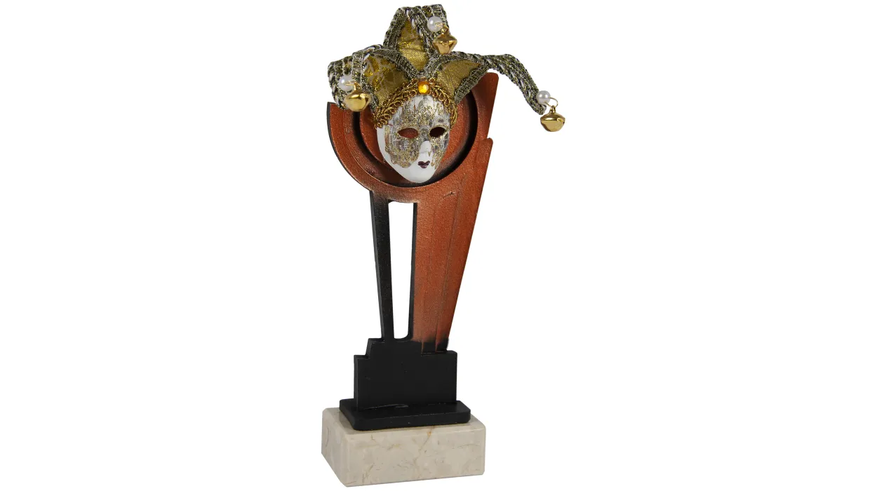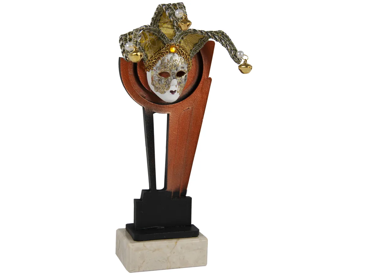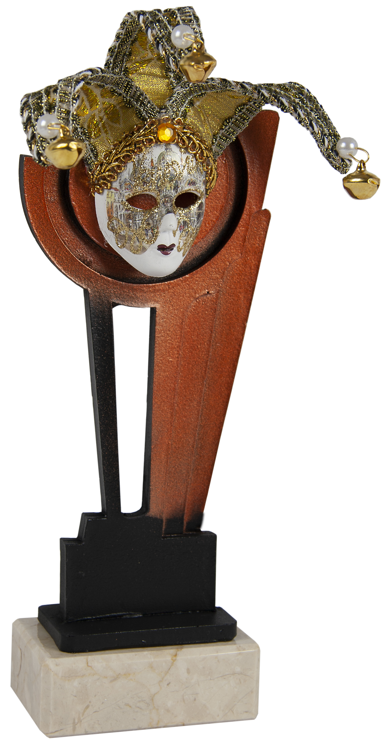 Faschingstrophäe mit Keramikmaske. Sockel aus schwarzem Marmor und Holz. Erhältlich in verschiedenen Größen.