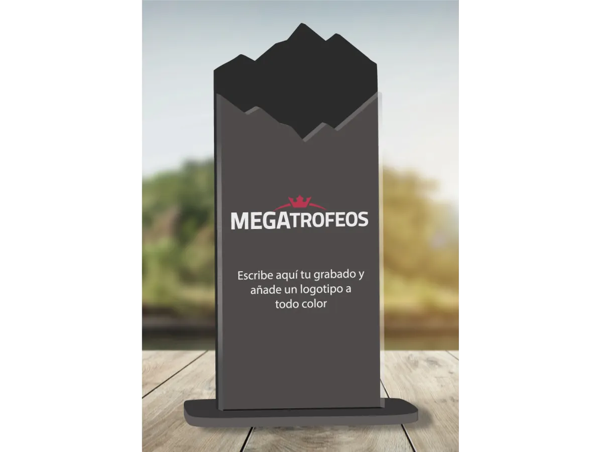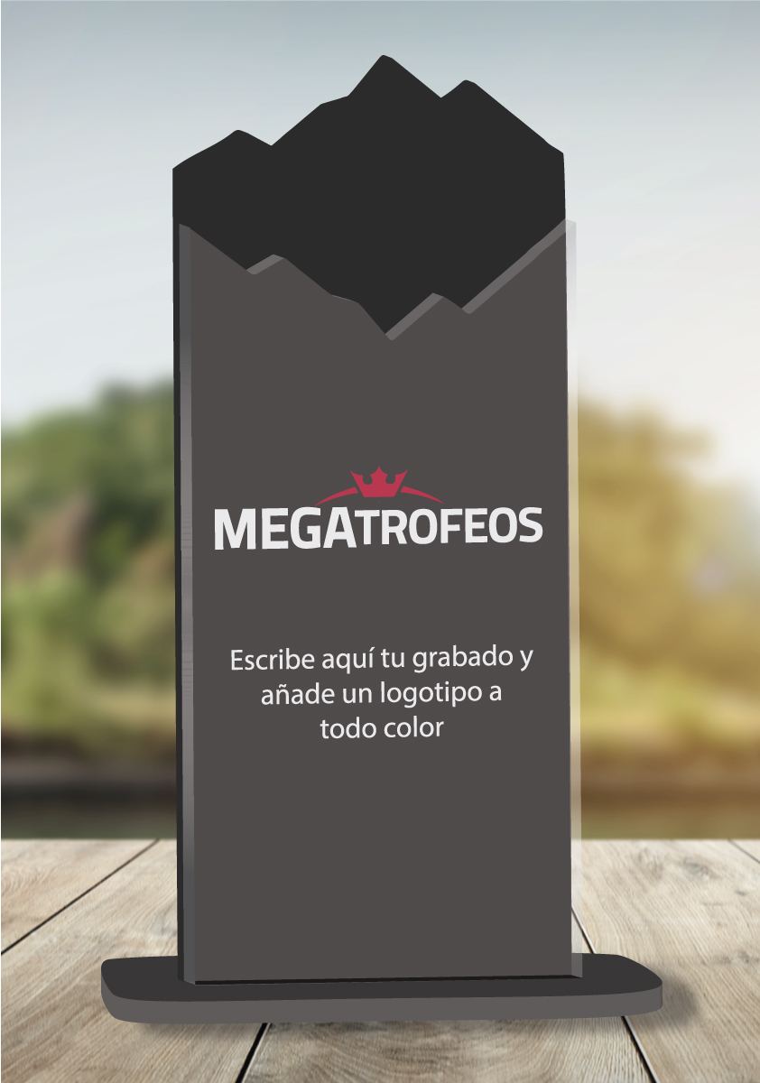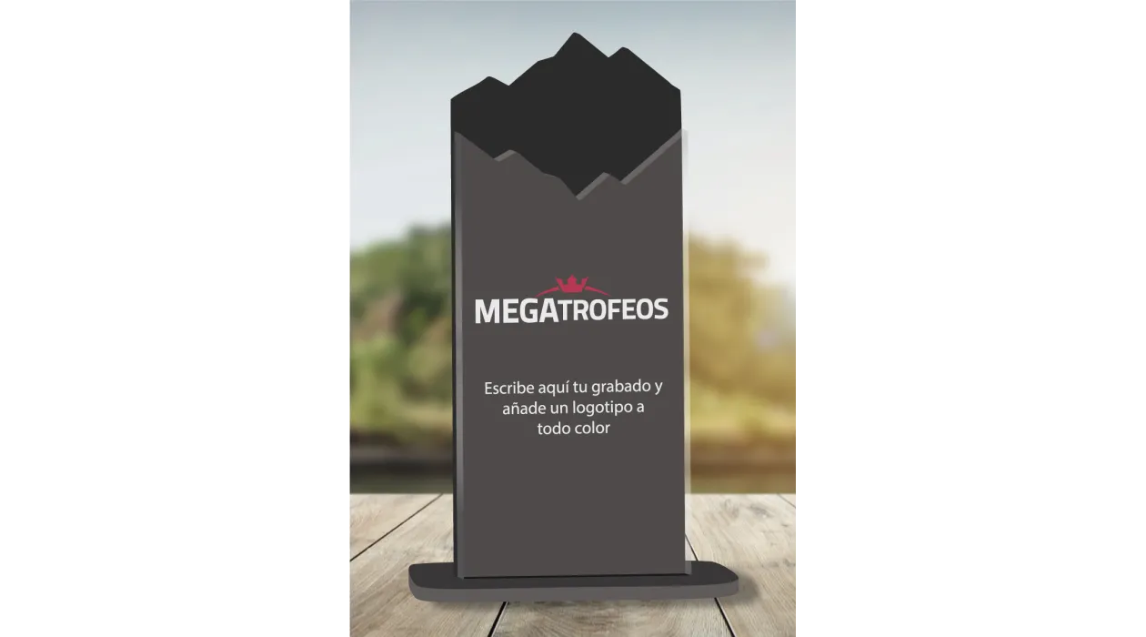 Trophäe aus Methacrylat, personalisiert mit zwei Schichten Methacrylat, auf der Vorderseite transparent und auf der Rückseite in der Farbe Ihrer Wahl. Sie können einen Text zum Gravieren direkt auf die Trophäe hinzufügen. Die überlappende Methacrylat-Silhouette ist 3 mm dick und der vordere Teil 8 mm.