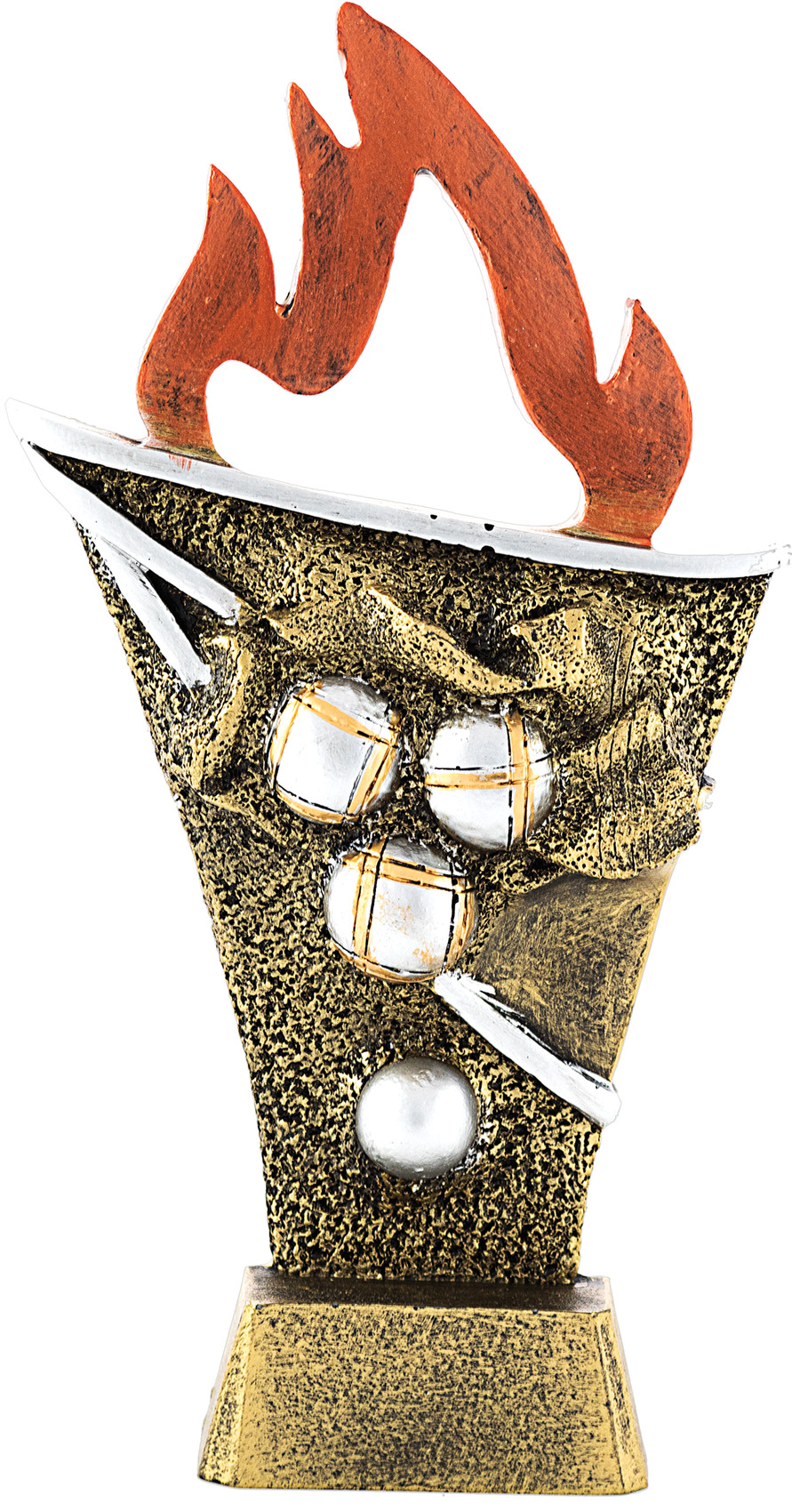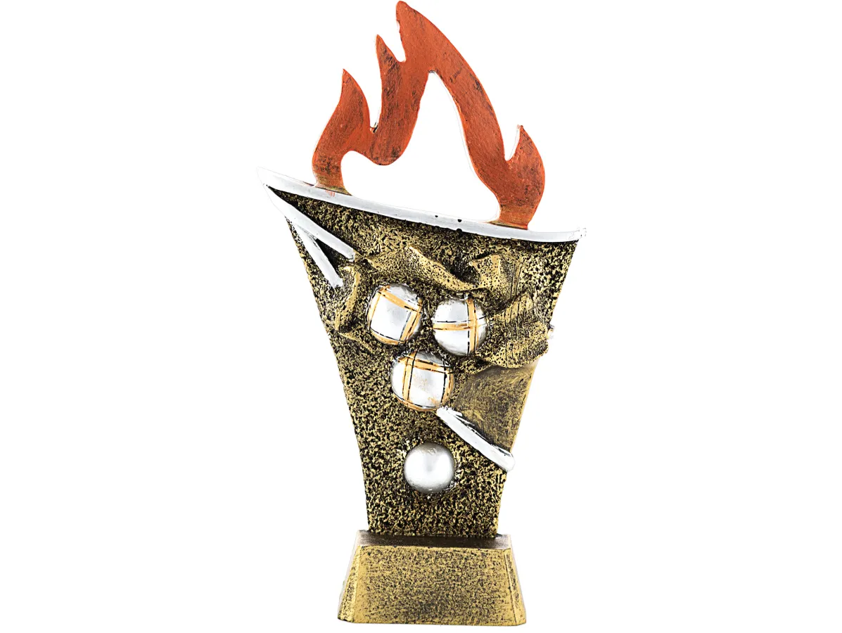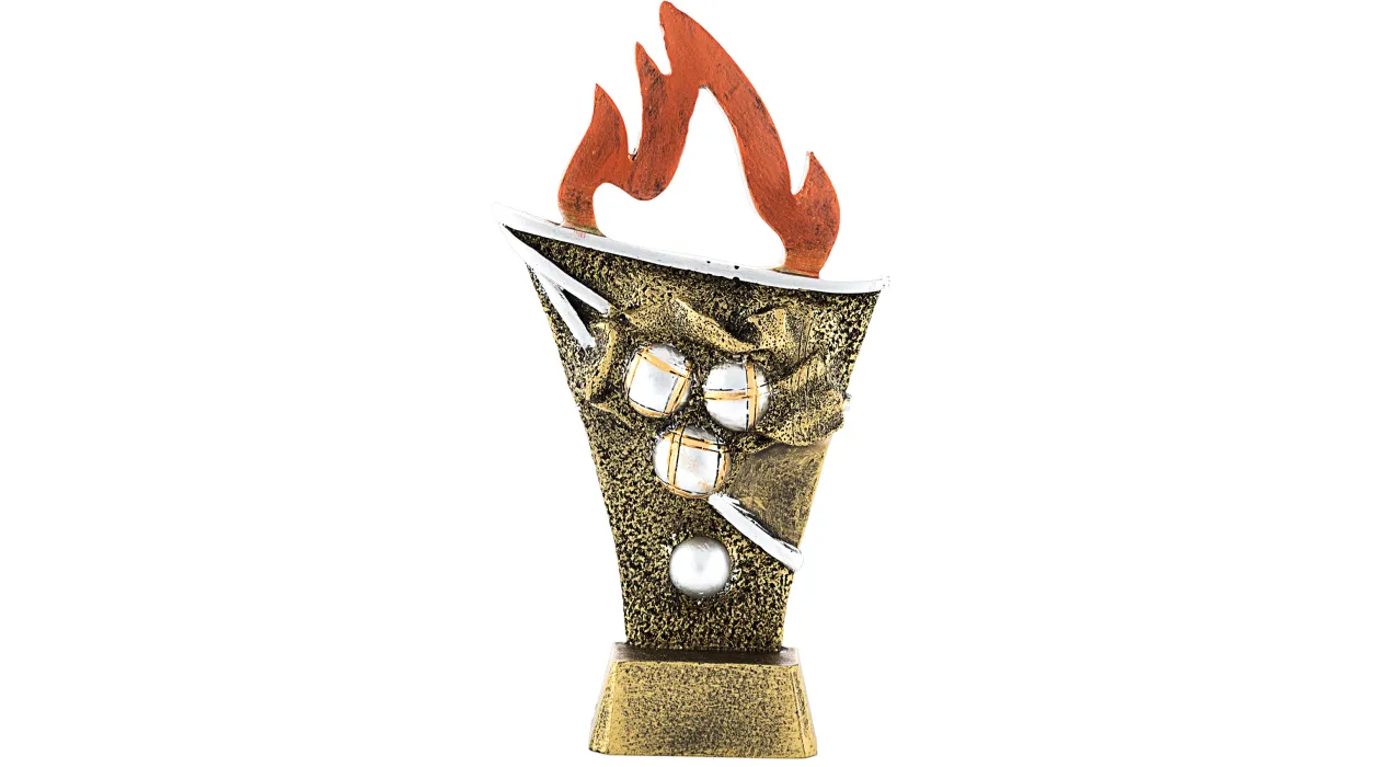 Trophäe aus Resin in Form einer Fackel und zentraler Applikation mit Pétanque-Kugeln. Verschiedene Größen erhältlich.