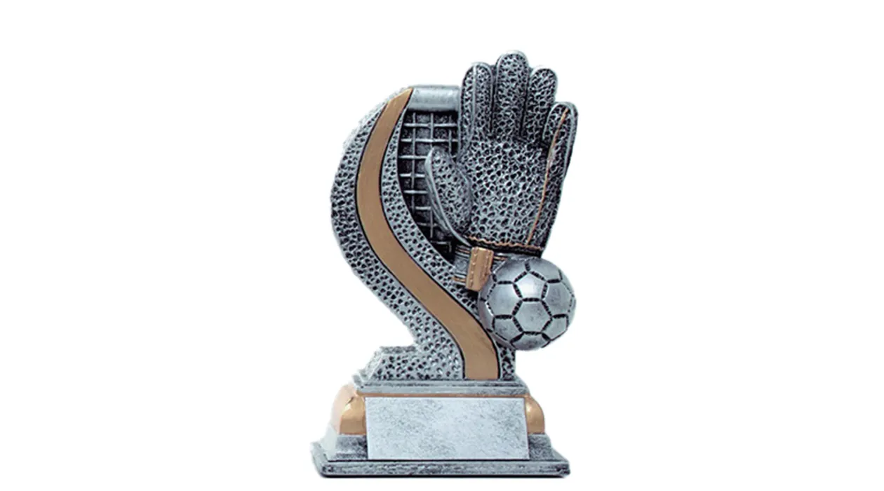 Fußballtrophäe mit der Darstellung eines Handschuhs und eines Balls, ideal zur Auszeichnung des besten Torwarts in einem Turnier oder Wettbewerb. Diese Trophäe ist perfekt, um das Können und die Geschicklichkeit der Torhüter auf dem Spielfeld hervorzuheben.