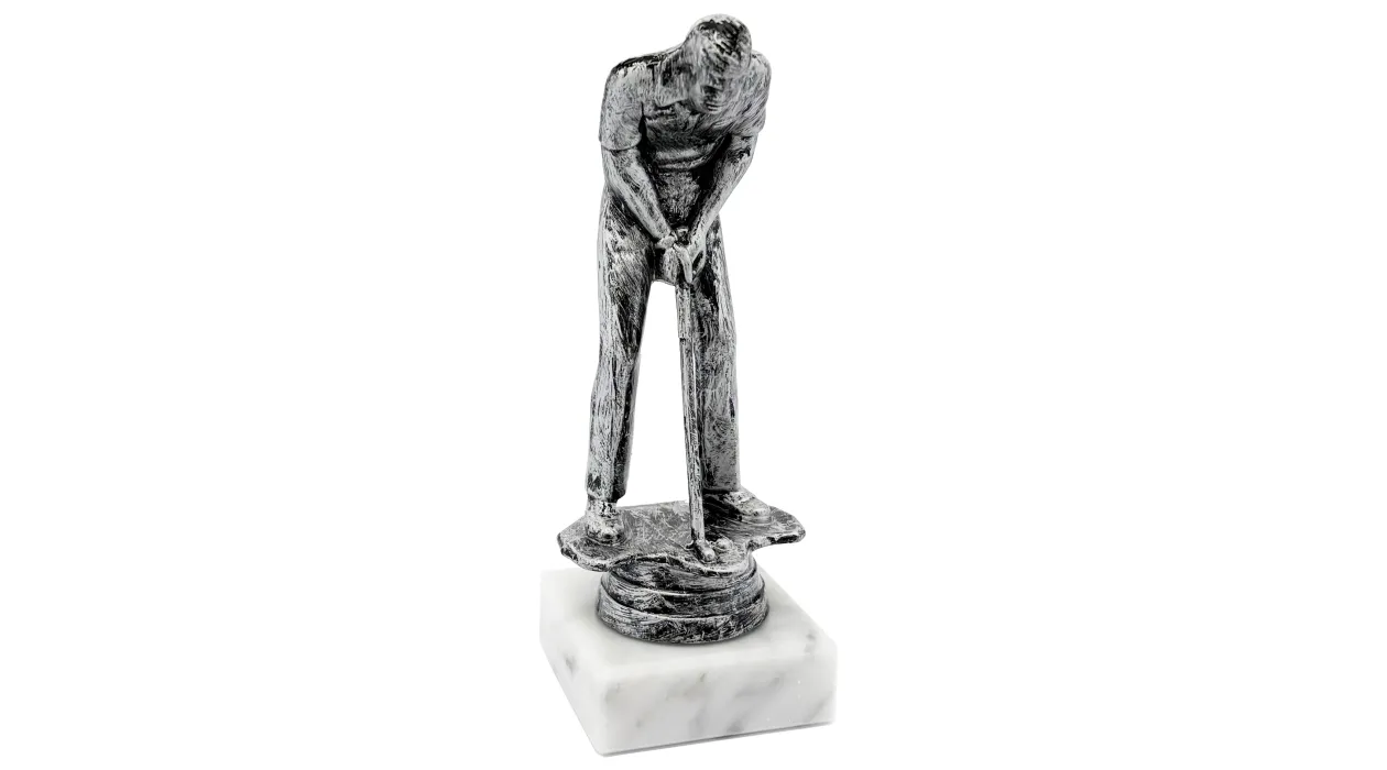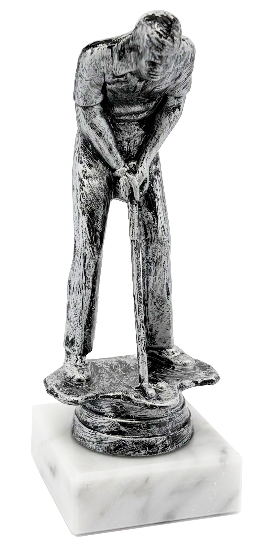 Golftrophäe in Form einer Statue eines Mannes, der einen Golfschläger hält. Die Statue ist bis ins kleinste Detail detailliert und fängt die Eleganz und das Können des Sports ein. Es ist das perfekte Geschenk zur Anerkennung von Golfleistungen und wird zum Highlight in jeder Vitrine und jedem Regal. Die Golftrophäe ist ein eindrucksvolles Zeugnis der Leidenschaft und des Engagements von Golfspielern.
