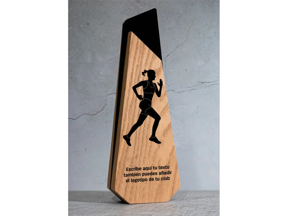 Diese aus Holz und Acryl gefertigte Trophäe für Frauen-Leichtathletik vereint modernes Design, hochwertige Materialien und exklusive Individualisierungsmöglichkeiten und würdigt berufliche Leistungen, Führungsqualitäten und Exzellenz. Ihre stilisierte geometrische Struktur verbindet die natürliche Wärme des Holzes mit der Eleganz des glänzenden schwarzen Acryls und schafft so ein stilvolles, langlebiges und optisch beeindruckendes Objekt.