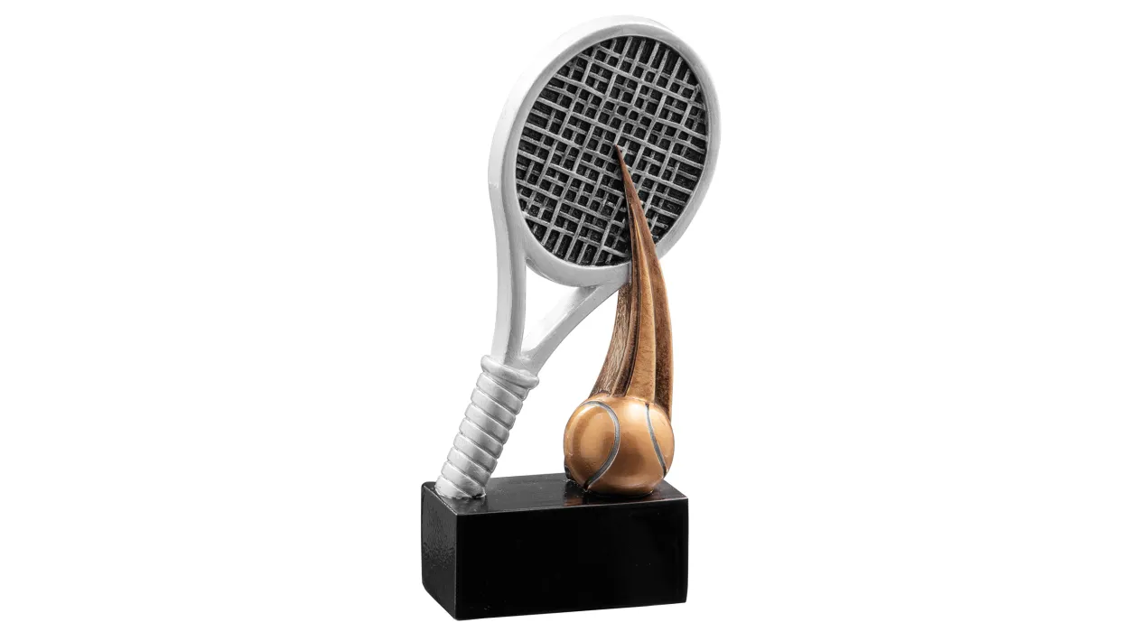 Feiern Sie jeden Punkt, Satz und Sieg mit dieser eleganten Tennistrophäe aus Kunstharz, die die Leidenschaft, Technik und den Einsatz der Spieler würdigt. Hergestellt aus hochwertigem Kunstharz mit silbernen und goldenen Metallic-Oberflächen, besticht sie durch ihr sportliches Design, das den Wettbewerbsgeist des Tennis verkörpert.