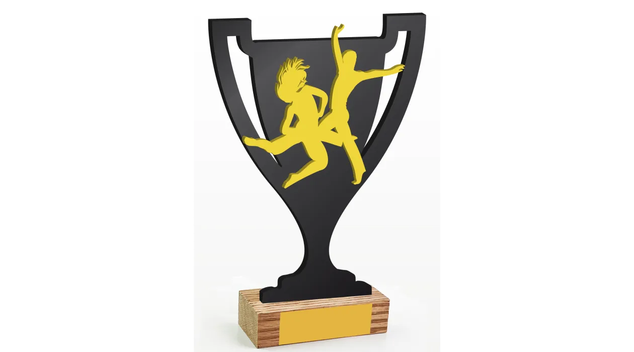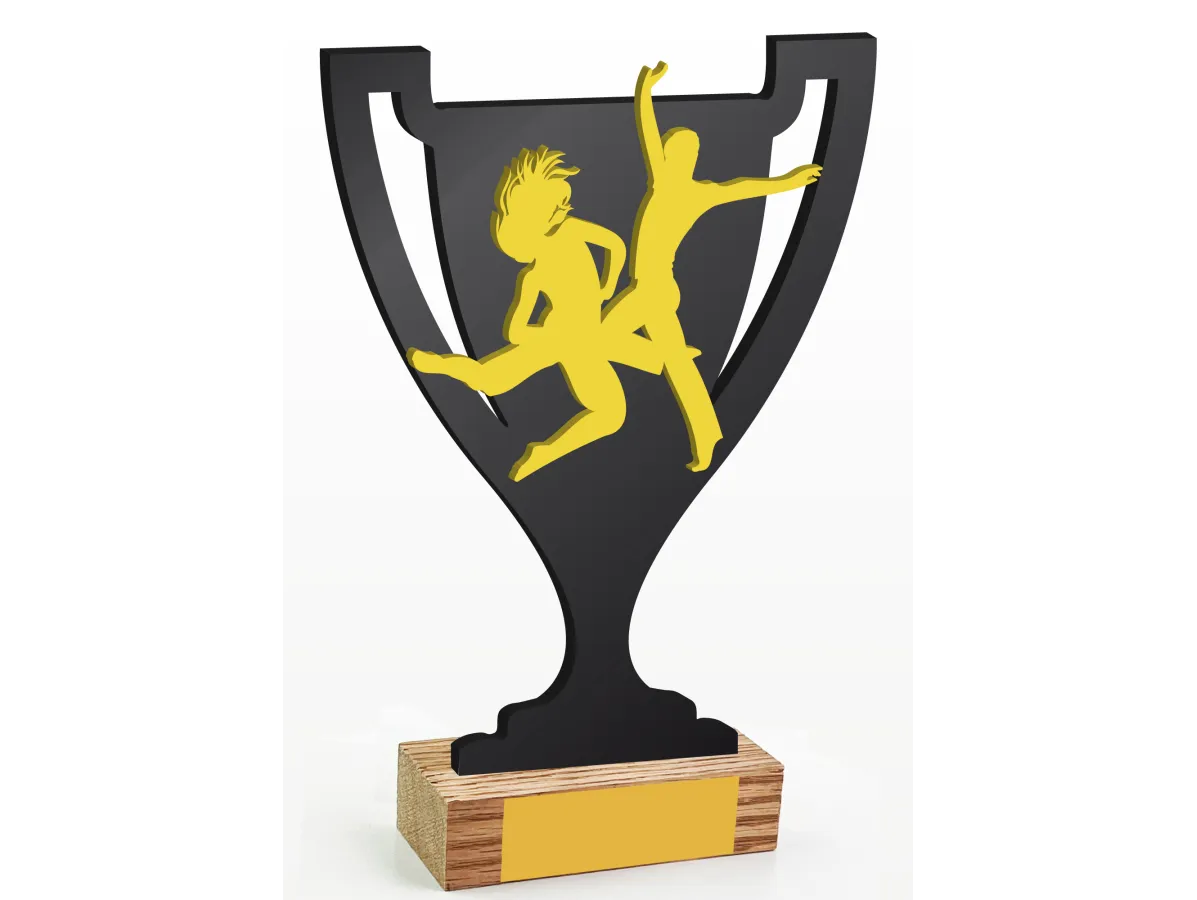 Trophäe aus schwarzem und goldenem Acryl. Er besteht aus zwei Silhouetten, der hinteren Silhouette in Form einer Tasse und der vorderen Silhouette in der Sportform der ausgewählten Sportart.Die Trophäe ist 8 mm breit und hat einen schwarzen Marmorsockel.
