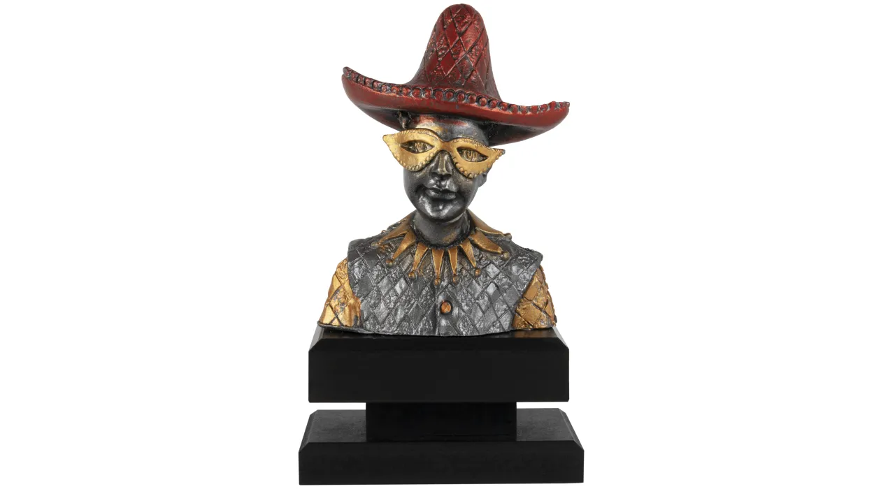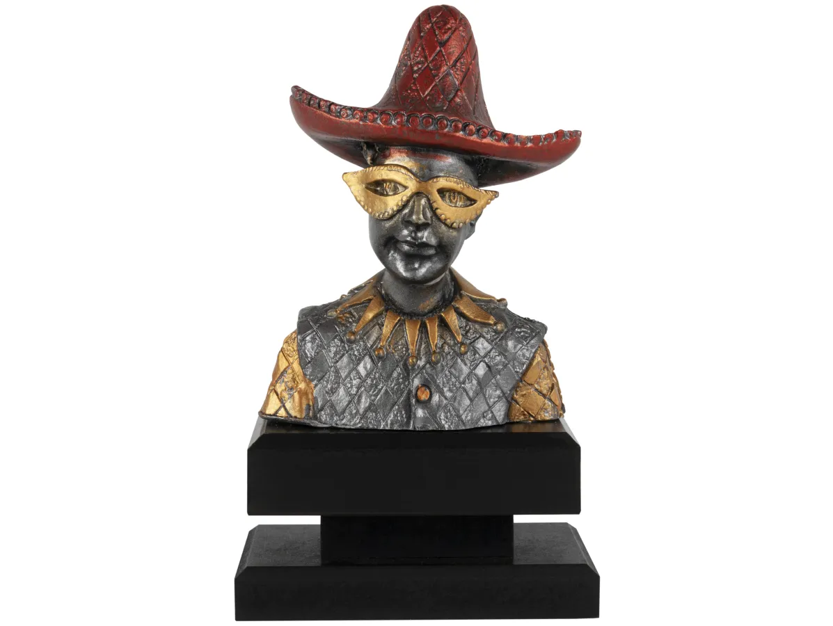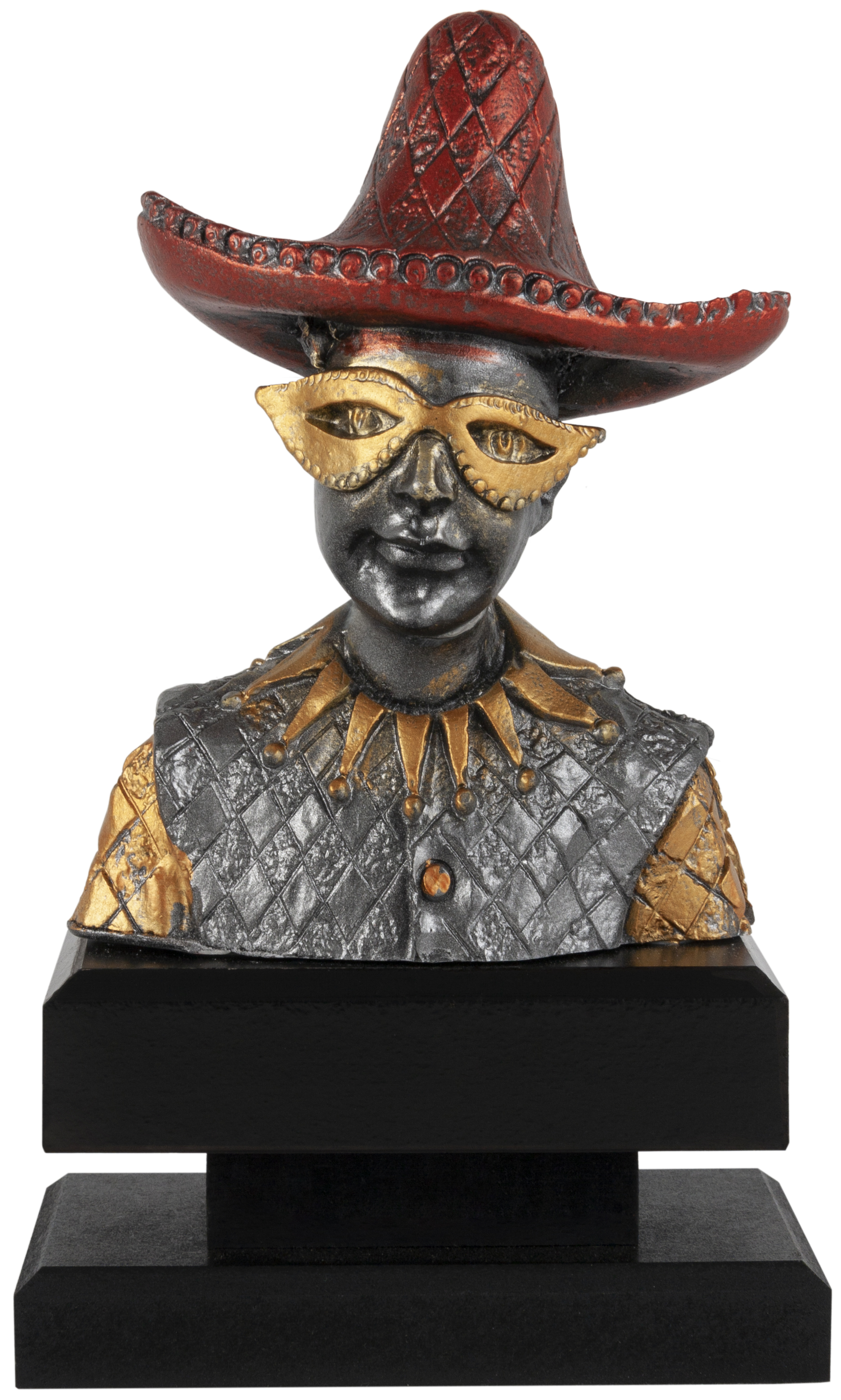 Trophäe für Karneval mit einer Harlekinfigur, aus Harz und Holz. Kunststoffsockel in Bronzefarbe. Erhältlich in verschiedenen Größen.